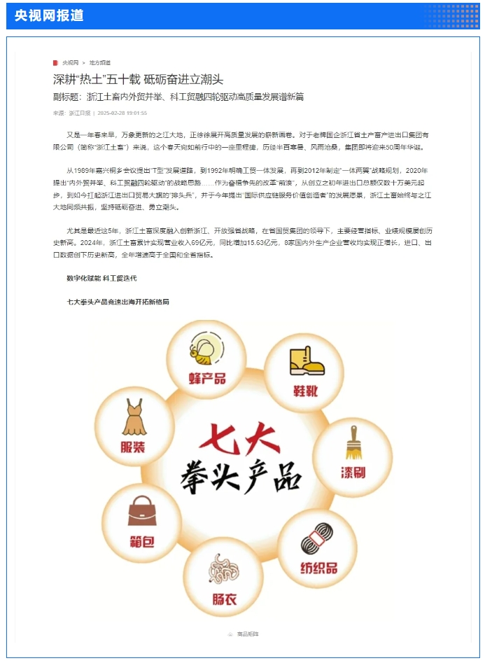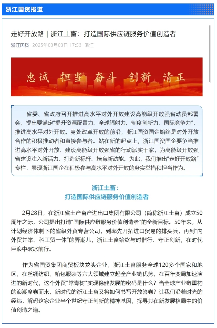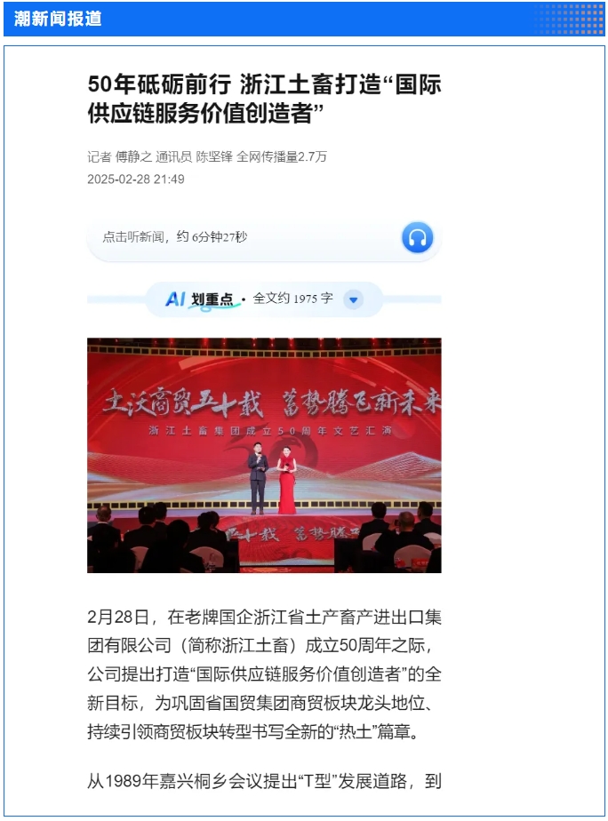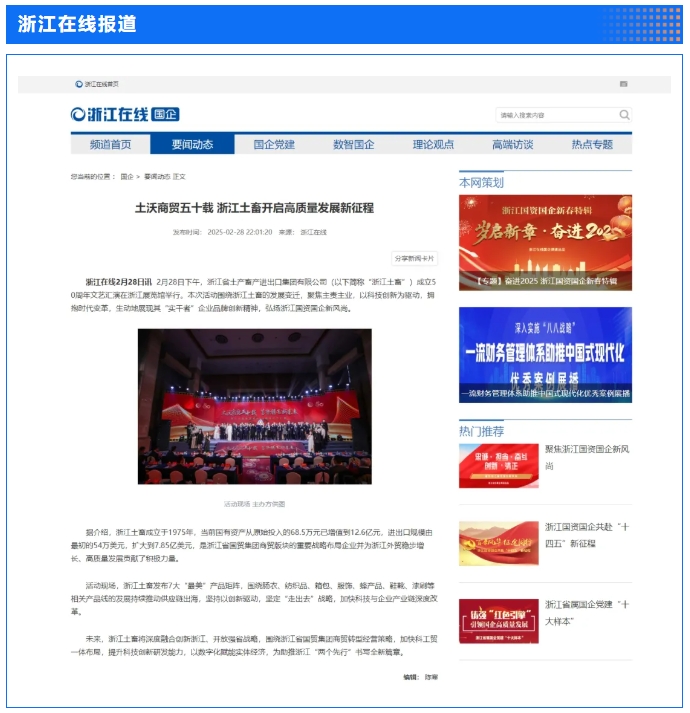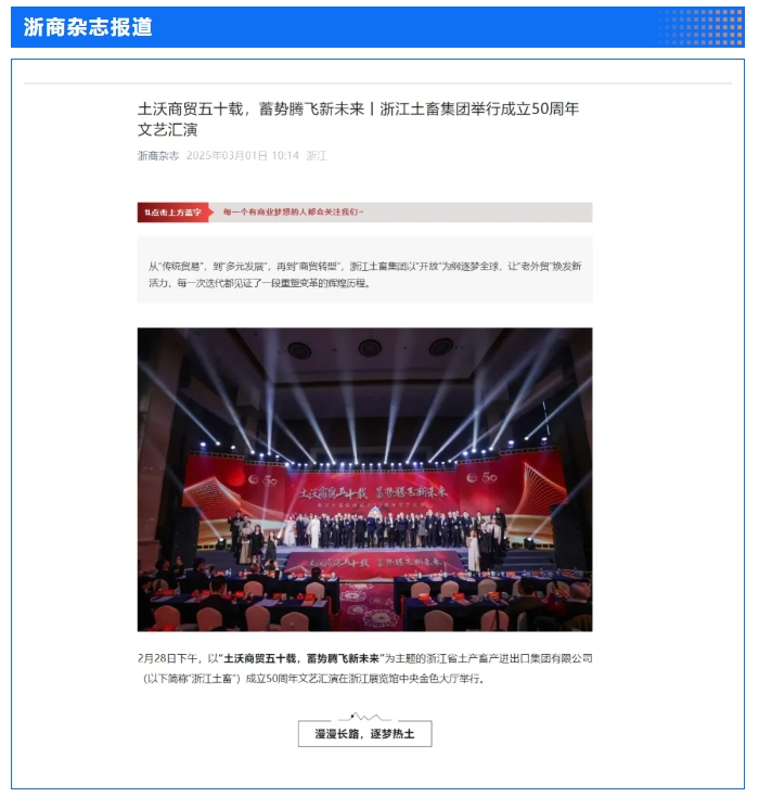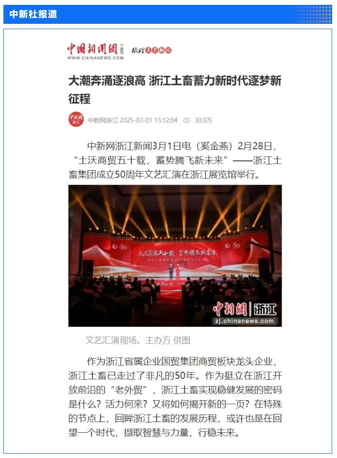 2月28日,“土沃商貿五十載,蓄勢騰飛新未來”——浙江土畜集團成立50周年文藝匯演在浙江展覽館中央金色大廳舉行。匯演生動展現了省國貿集團下屬浙江土畜一路走來的蝶變歷程,更憧憬展望了浙江土畜美好未來。中新社、央視網、浙江日報、浙江國資、浙江在線、潮新聞、浙商雜志等多家媒體對匯演進行了報道。
